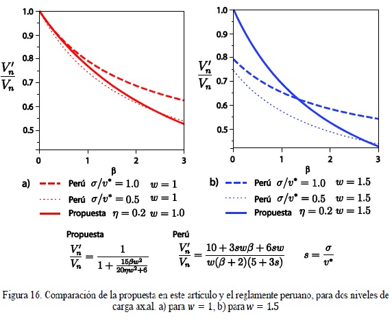 La ec. 17 es la expresión que predice la reducción del cortante resistente nominal en función del Se observa en a) que la propuesta de esta contribución es parecida a la peruana si el nivel de carga es s = 0.5 y que el reglamento peruano reduce menos la resistencia a corte si la carga axial es mayor. Esto se debe a que el término de la carga no está afectado por el factor de reducción y a medida que la carga axial es mayor, esta representa una mayor proporción de la resistencia. En b) cuando el muro es más esbelto (w = 1.5) el reglamento peruano predice una reducción aun cuando el muro esta en voladizo (β = 0); dicha predicción contradice lo observado experimentalmente (fig. 1). La predicción que aquí se propone no reduce la resistencia cuando no hay momento en el extremo superior del muro, es menos conservadora que el reglamento peruano hasta cierto punto: en muros con elevada carga axial el código peruano reduce menos la resistencia.