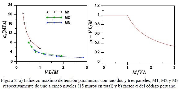 En muros esbeltos a pesar de que se ha observado una reducción de la resistencia a cortante (Matsumura 1988), (Zeballos, y otros 1992) esta no ha sido incluida en los códigos a excepción del caso particular del reglamento de Perú. En la ec. 2 se presenta la expresión utilizada por el código peruano para establecer la resistencia nominal a corte por tensión diagonal. En la fig. 2.b se presenta la variación de la resistencia básica de la mampostería con la relación (M/VL).