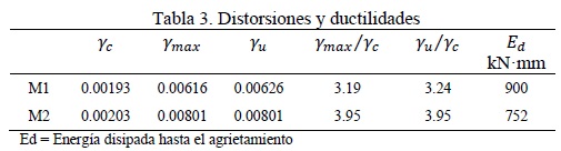En la tabla 2 se incluyen los valores de desplazamiento y fuerza cortante de los puntos críticos: el primer agrietamiento diagonal, resistencia máxima y última. Los valores de las deformaciones correspondientes a la carga de agrietamiento, a la carga máxima y última así como las ductilidades se presentan en la tabla 3.