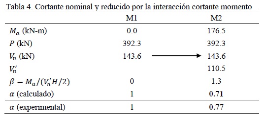 En la evaluación, se tomó como resistencia nominal Vn1 el valor de la carga de agrietamiento del muro M1, probado sin momento flexionante y la carga de agrietamiento V'n2, al valor registrado de la carga lateral cuando se produjo el agrietamiento del muro M2, probado con momento Ma2 = 176.52 kN-m. Se calculó el cociente α = V'n2/Vn1 y se comparó con los que predice la ecuación (7). Para el cálculo del parámetro η se emplearon los valores promedio de G y E de todas las pilas probadas y el parámetro β como β = Ma2/(V'n2H/2).