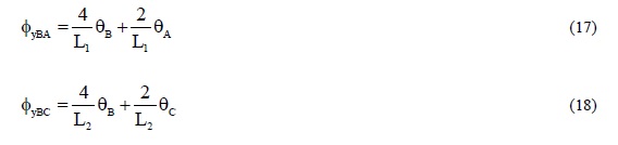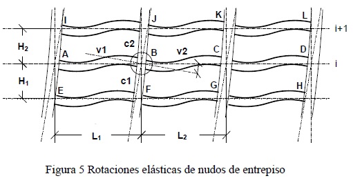 donde E es el módulo de elasticidad, I es el momento de inercia, L es el claro, θ es la rotación del nudo, M es el momento en el extremo del elemento. Los subíndices v1, v2, c1 y c2, denotan los elementos, y A, B, C, F y J, identifican los nudos.