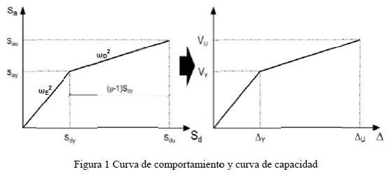 El concepto fundamental en que se basa el método propuesto es el de sistema de referencia, que se define como un oscilador bilineal de un grado de libertad, cuyas características corresponden a las del modo fundamental, mediante el cual es posible aproximar la respuesta elástica y máxima de un sistema de múltiples grados de libertad con comportamiento inelástico (Ayala, 2001). Por consiguiente, la descripción del comportamiento estructural se realiza por medio del trazo de Sa vs. Sd del sistema de referencia, que en este método se denomina curva de comportamiento (ver fig. 1). De acuerdo con principios básicos de dinámica estructural, es posible aproximar la curva de capacidad del sistema estructural a partir de la curva de comportamiento (Freeman et al., 1984).