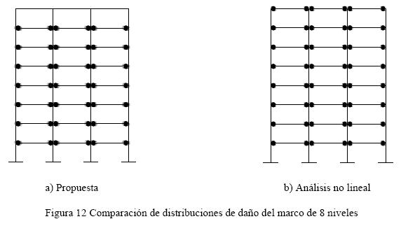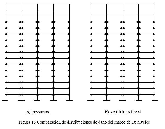 3) Definición de una distribución de daño para el estado límite último, congruente con el comportamiento columna fuerte-viga débil, i.e, fluencia de la mayor parte de las vigas y quizá la base de algunas columnas.
