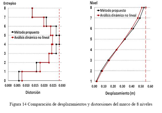Las propiedades de la curva de comportamiento requeridas por las estructuras para satisfacer el estado límite considerado se muestran en la tabla 1. Las figs. 12 y 13 muestra las comparaciones entre las distribuciones de daño propuestas y las obtenidas del análisis dinámico no lineal paso a paso, en donde se observa una buena correspondencia entre ambas. Como consecuencia del control efectivo del daño estructural, fue posible predeterminar eficientemente la respuesta de desplazamientos y distorsiones de las estructuras diseñadas (figs. 14 y 15). Asimismo, en la fig. 16 se presentan las gráficas de cortante vs. desplazamiento en donde se observa que ambas estructuras fueron capaces de disipar energía histerética, conforme con la ductilidad desarrollada. Por lo tanto, fue posible aproximar suficientemente la respuesta dinámica no lineal esperada en las estructuras diseñadas y, por ende, predeterminar una configuración de desplazamientos y garantizar el cumplimiento del nivel de desempeño considerado.