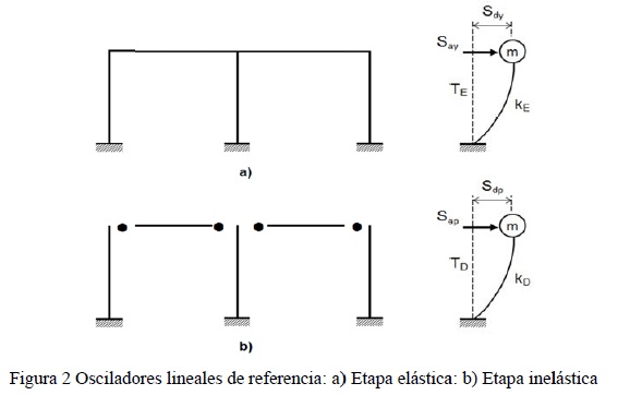 La ec. 1 muestra la relación entre el desplazamiento y la seudo aceleración espectral de la etapa elástica, en donde se observa que dicha relación se puede obtener de la respuesta de un oscilador lineal con masa unitaria, rigidez elástica kE = ωE2 y sujeto a un cortante basal 1×Say (ver fig. 2a). De manera similar, la etapa inelástica (o de posfluencia) del sistema se puede representar mediante un oscilador lineal con una rigidez asociada al estado de daño de la estructura, lo cual es demostrable por medio del desarrollo de las ecuaciones anteriores.