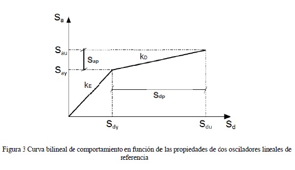 Los puntos que definen las ramas de la curva de comportamiento se denominan puntos característicos: fluencia, (Sdy, Say), y último, (Sdu, Sau). La primera rama representa la etapa de comportamiento elástica del sistema, y la segunda describe las características de su etapa inelástica, esta última asociada a un estado de daño. Las pendientes de la curva son las frecuencias circulares al cuadrado, ωE2y ωD2, correspondientes a cada etapa de comportamiento. Los niveles de resistencia de los elementos estructurales que se comportan elásticamente y aquellos que presentan daño, están directamente relacionados con Say y Sau, respectivamente.