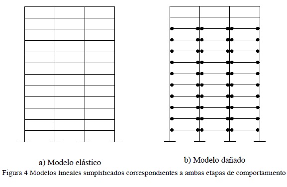 Para definir las pendientes de la curva de comportamiento de una estructura se asume que es posible estimar las propiedades dinámicas de las etapas elásticas e inelástica, i.e., frecuencias de vibrar y formas modales, a partir de dos modelos lineales simplificados. El modelo elástico (ver fig. 4a), se define a partir de la geometría de la estructura, considerando las rigideces efectivas de los elementos estructurales. El modelo dañado, asociado a la etapa inelástica, es una réplica del elástico en donde los puntos de comportamiento inelástico se representan mediante articulaciones simples, conforme con la distribución de daño que se presenta en el sistema estructural en dicha etapa (fig. 4b).