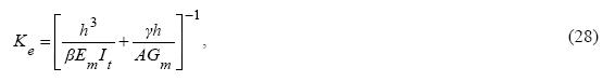 donde h es la altura efectiva del muro, Em es el módulo de elasticidad de la mampostería, Gm es el módulo de rigidez al corte, A es el área efectiva al cortante, β es un factor que depende las condiciones de apoyo en los extremos del muro y que se considera igual a 3 para muros en voladizo y de 12 para muros doblemente empotrados, en este trabajo se consideró β=12.0 . El valor del factor correctivo, γ, es de 1.2 para muros con sección rectangular, aunque puede usarse un valor de γ=1.0 si los muros tienen castillos en sus extremos que actúan como patines; en este trabajo se consideró γ=1.2. El momento de inercia de la sección transformada, It, se puede calcular con: