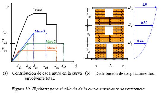 (4) La contribución individual de los muros para resistir la fuerza lateral del entrepiso dependen de los desplazamientos laterales tomados por el muro y de la forma de la curva envolvente idealizada de resistencia del muro. Los muros resisten los desplazamientos impuestos hasta agotar su capacidad de ductilidad individual, aunque pueden fallar por carga lateral, todavía son capaces de resistir carga vertical.