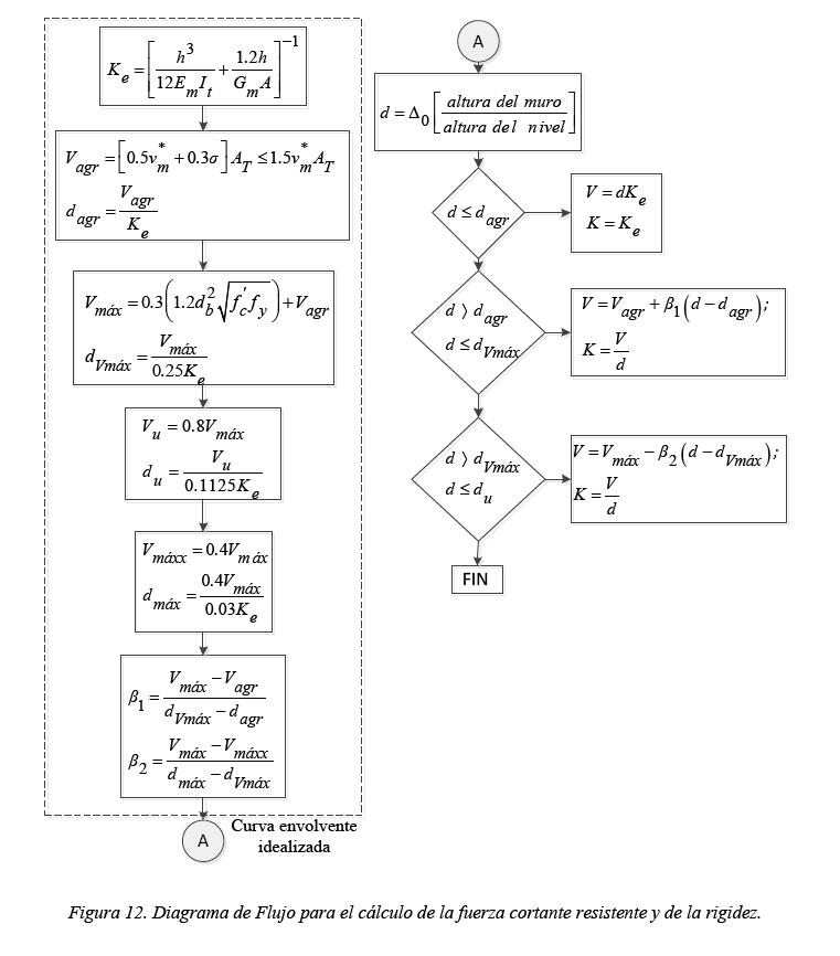 donde vm* es la resistencia a compresión diagonal de la mampostería, σ es el esfuerzo de compresión y AT es el área transversal del muro, incluidos los castillos, sin transformar su área. La mampostería no se comporta elásticamente, ni siquiera para pequeñas deformaciones. Sin embargo, la rigidez elástica efectiva, Ke , se puede definir como la pendiente de la primer recta de la curva idealizada,