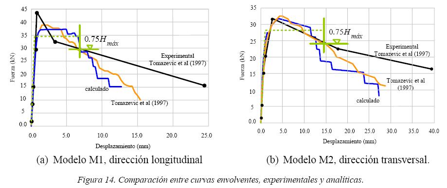 Con el fin de comprobar el procedimiento de cálculo de las curvas envolventes de resistencia lateral de piso, se calcularon las curvas envolventes de los modelos reportados en Tomazevic y Klemenc (1997b) usando la curva trilineal propuesta por dichos autores. Los modelos corresponden a una estructura de tres niveles de mampostería confinada y probados en una mesa vibradora. Al modelo de la estructura probada en la dirección longitudinal es M1 y en la dirección transversal M2. En la Figura 14 se comparan las curvas envolventes de resistencia del primer nivel calculadas analíticamente en este trabajo con las reportadas experimentalmente en dicha referencia. En las Figuras 14a y 14b se observa que los valores de la curva analítica que definen la rama ascendente, el cortante máximo, la fuerza cortante en la que se presenta el primer agrietamiento así como el desplazamiento que lo acompaña se compra bien con los valores obtenidos experimentalmente. Las curvas analíticas calculadas en este trabajo difieren a lo más en 5% con respecto a las analíticas reportadas en Tomazevic y Klemenc (1997b),atribuible a la diferencia de valores tomados como referencia en las curvas trilineales.