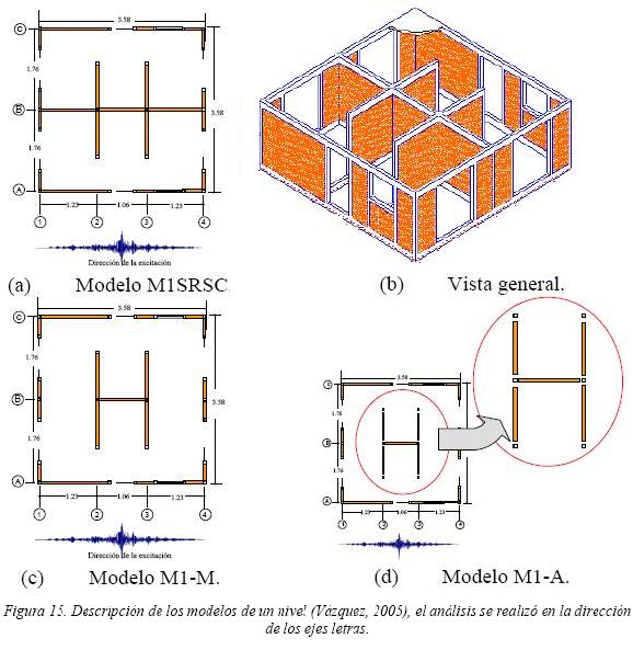 Para comparar el procedimiento y el modelo de la curva envolvente propuesta, se compararon las curvas envolventes de resistencia de piso obtenidas analíticamente con las experimentales en una serie de modelos ensayados en la mesa vibradora del Instituto de Ingeniería de la UNAM, II-UNAM (Vázquez, 2005; Barragán, 2005; Arias, 2005) y con la obtenida en el ensayo con carga cíclica reversible del modelo 3D (Sánchez, 1998). Los datos referentes a dimensiones y propiedades de los materiales empleados en los modelos se especifican en las referencias antes citadas.