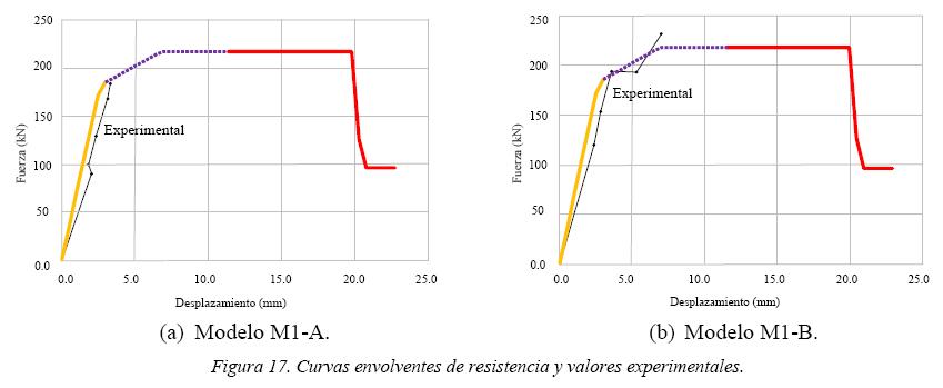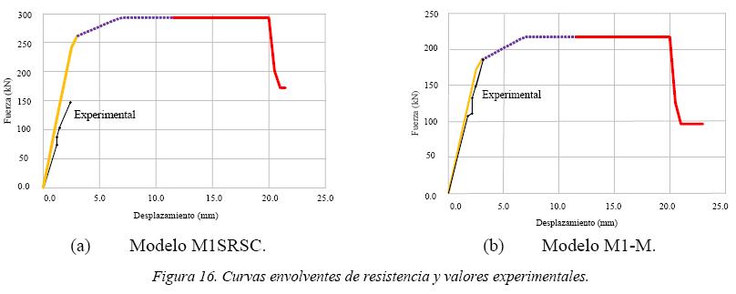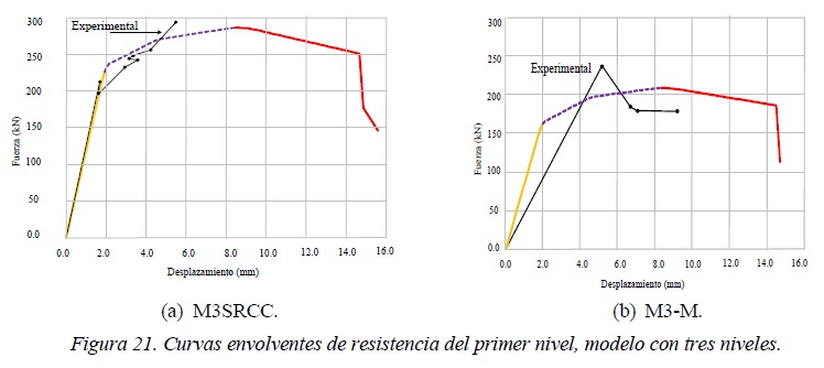 Las curvas envolventes de resistencia del primer nivel se calcularon con los valores considerados anteriormente. Las pruebas experimentales del modelo M3SRCC se suspendieron antes de que se presentara degradación de resistencia, por lo que los valores experimentales sólo son comparables con los analíticos en la rama ascendente (Figura 21a). Se encontró que los valores analíticos calculados en este trabajo se ajustan mejor con los experimentales que los calculados con la metodología de la columna ancha (Figura 1b). Los datos experimentales obtenidos con el modelo M3-M no son comparables con los resultados analíticos debido a que cuando se ensayó este modelo se encontraba agrietado debido a ensayos anteriores (Figura 21b).