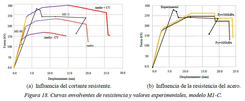 La cuarta modificación al modelo consistió en colocar sobre el modelo M1-A un peso de 20.6 kN (2100 kgf) y recibió en nombre de M1-C. En la Figura 18a se muestra la curva envolvente y los valores experimentales obtenidos en este modelo. Debido a que el modelo M1-C presentaba agrietamiento importante en el momento de la prueba la curva envolvente y los valores experimentales se separan en la rama ascendente, lo cual no pasa al comparar en la misma figura los valores del modelo M1-M. También se observa que la carga máxima experimental es mucho mayor que la que se predice en forma analítica usando un módulo de cortante promedio. Sin embargo, los valores del módulo de cortante de la mampostería utilizada en el modelo presentan un coeficiente de variación (CV) de 0.39. Si se calculan las curvas envolventes con el valor medio más el CV y el valor medio menos el CV, se observa la influencia de este parámetro sobre la forma y magnitud de las cargas resistentes(Figura 18a). Para este caso la curva calculada con el valor de esfuerzo promedio más el CV, envuelve a los datos experimentales. El esfuerzo de fluencia del acero de refuerzo utilizado en los castillos durante la prueba también presentó variaciones importantes, pero como se observa en la Figura 18b, no tiene una influencia importante en la curva envolvente. En este trabajo se utilizó un valor de 440 MPa que es el valor medio del acero utilizado en la prueba.