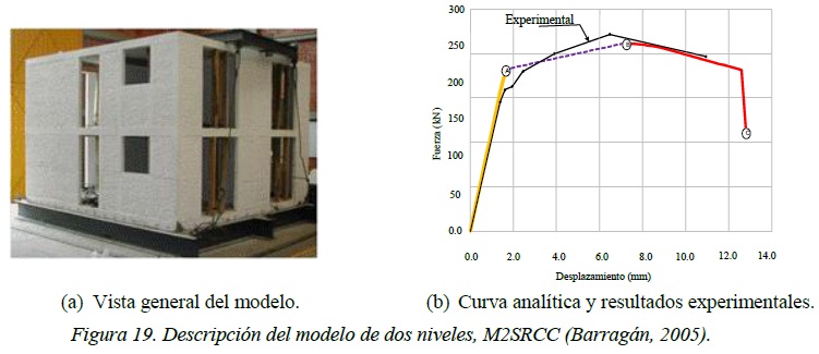 En la segunda serie de estructuras de mampostería probadas en la mesa vibradora del II-UNAM, se modeló una estructura de dos niveles (Barragán, 2005) con la misma estructuración y características de los materiales empleados en el modelo de un nivel, M1-M, descrito en la Figura 15c. Dicho modelo recibió el nombre de M2SRCC y se muestra en la Figura 19a. La curva envolvente de resistencia del primer nivel junto con los resultados experimentales se presentan en la Figura 19b. En este caso la curva envolvente se calculó considerando: