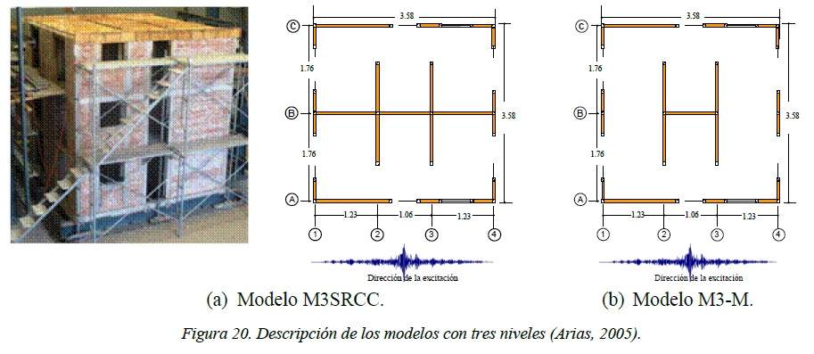 Como se observa en la Figura 20 el tercer modelo de mampostería ensayado en la mesa vibradora del II-UNAM, representa una estructura de tres niveles (Arias, 2005) y tenía similares características mecánicas de los materiales empleados en los anteriores modelos: M1SRSC y M2SRCC. El modelo fue ensayado con dos configuraciones diferentes: el M3SRCC con una distribución de muros similar al modelo M1SRSC (Figura 20a) y el modelo M3-M sin los muros centrales (Figura 20b).