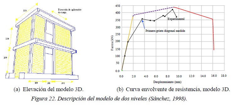 El cuarto modelo es el ensayado en el Laboratorio de Estructuras Grandes del CENAPRED, con carga cíclica reversible y una configuración en planta ideal y simétrica (Sánchez, 1998). Este modelo es llamado 3D (Figura 22a) y consistió de dos niveles a escala 1:1 con mampostería confinada. La curva envolvente de resistencia del primer nivel y los resultados experimentales se muestran en la Figura 22b. Se observa que la curva envolvente predice muy bien la carga lateral máxima y su desplazamiento asociado; además del cortante de agrietamiento, aunque no el desplazamiento en el que se presenta. En este caso no fue posible verificar el desplazamiento a la carga última ya que el modelo no se llevó al colapso debido a que durante el trabajo experimental se planeaba repararlo.