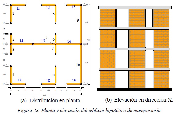 En la Figura 23 se observa la distribución en planta de los muros y la elevación en la dirección X del edificio por analizar. En la dirección X el edificio presenta una excentricidad de 0.83m que es el 97% del ancho en planta del edificio, siendo la excentricidad máxima permitida en esta dirección 0.85 m. La altura de los entrepisos es 2.50m y se considera que el edificio se ubica en la zona sísmica III del Valle de México. El sistema de piso está formado por una losa de 0.10m de espesor y los muros tienen un espesor de 0.12m. El diseño se realizó tal que la mayoría de los muros de planta baja están esforzados al límite del cortante último actuante. En la tabla 3 se muestran las propiedades de los materiales utilizadas en este ejemplo.