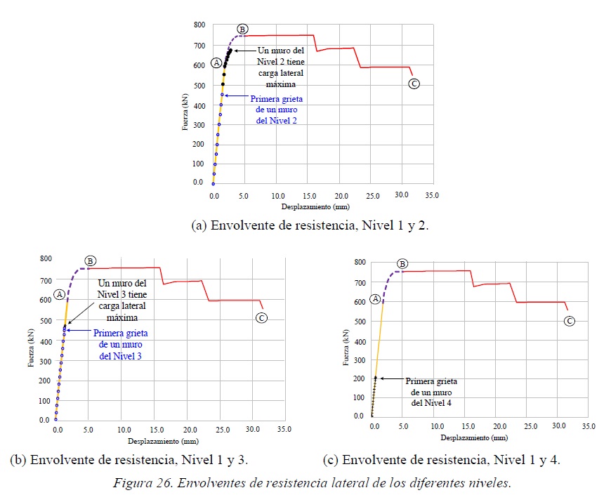 La metodología de incrementar los desplazamientos y no las cargas laterales, resultó estable, evitándose problemas de inestabilidad numérica al invertir la matriz de rigidez en cada ciclo del proceso. Una ventaja que presenta la metodología propuesta es que se puede determinar el estado de los muros que pertenecen a un entrepiso en particular, tal y como se muestra en la Figura 26. En la Figura 26a se muestran las curvas envolventes del entrepiso 1 y 2; en la Figura 26b las curvas envolventes del entrepiso 1 y 3, y finalmente en la Figura 26c las curvas del entrepiso del nivel 1 y 4. Se puede ver que el cortante de agrietamiento disminuye en las envolventes de los pisos superiores, debido a que su capacidad de resistencia lateral es menor que la de los muros del primer nivel por tener menor esfuerzo a compresión. Cuando se cumple alguno de los criterios de falla en el nivel 1, el segundo nivel presenta una envolvente que se aproxima a la carga lateral máxima. Esto es congruente con la evidencia experimental en edificios con baja altura (Tomazevic y Klemenc, 1997).