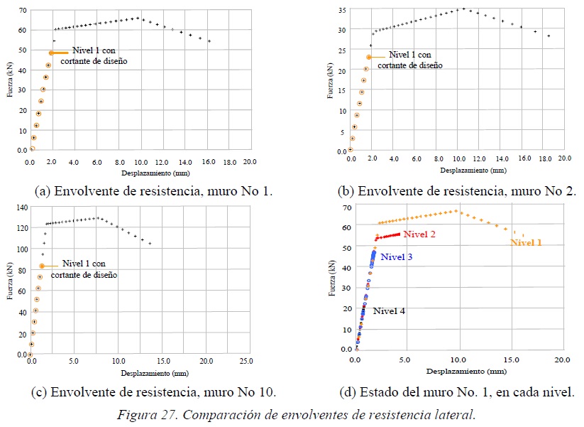 Otro beneficio de este tipo de análisis es que permite determinar el estado de un muro en particular, para cierta fuerza cortante lateral. Como ejemplo, en las Figuras 27a a la 27c (27b), se muestran las curvas envolventes de resistencia lateral de los muros 1, 2 y 10 de la planta baja del edificio (Figura 23a), además, se indica el punto en el que el nivel 1 de la estructura alcanza el cortante de diseño. En la Figura 27d se muestran las envolventes de resistencia lateral del muro No. 1 ubicado en los diferentes niveles de la estructura. Así se pueden determinar el estado límite de comportamiento que tiene cada muro en particular y el estado de daño asociado.