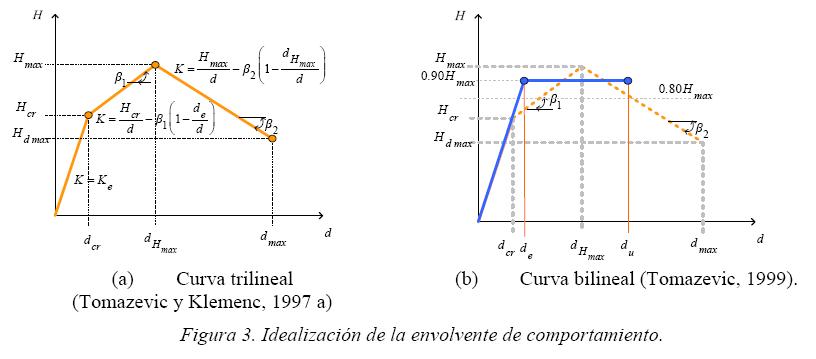 En cuanto a los modelos analíticos basados en una curva envolvente de comportamiento histerético de muros de mampostería, Meli (1979) propuso una curva trilineal que relaciona el esfuerzo cortante con la distorsión asociada. Moroni, Astroza y Tavonatti (1994) a partir de estudios experimentales realizados en estructuras de mampostería confinada, propusieron un modelo trilineal para caracterizar el comportamiento no-lineal de la mampostería ante cargas laterales. Flores (1995) con base en los resultados experimentales obtenidos en el Centro Nacional de Prevención de Desastres (CENAPRED) propuso un modelo analítico para representar la rigidez de los lazos de histéresis en los ciclos de carga y descarga. El modelo de Flores se basa en la teoría de fricción y es similar al de Meli (1979) excepto que el tercer tramo de la curva considera degradación de resistencia. Tomazevic propuso representar el comportamiento histerético de muros de mampostería sujetos a carga lateral en combinación con carga vertical usando curvas envolventes de tipotrilineal (Tomazevic y Klemenc, 1997a) y bilineal (Tomazevic, 1999). En la Figura 3 se muestran esquemáticamente dichas curvas, los valores que las definen se pueden encontrar en las referencias antes citadas.