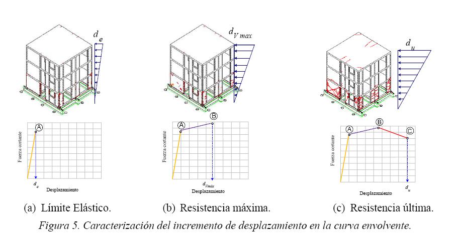 La curva envolvente de resistencia (Figura 5) define tres estados límites característicos: (A) Límite Elástico, cuando un muro en el entrepiso alcanza el límite elástico y se agrieta; (B) Estado de Resistencia Máxima; y (C) Estado de Resistencia Última, donde la resistencia del entrepiso se deteriora sobrepasando un límite aceptable establecido. Para fines prácticos, una degradación mayor al 70% de la resistencia máxima define el estado de colapso de la estructura.