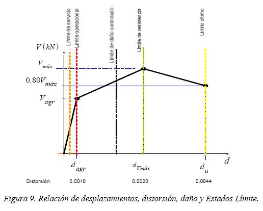 que es igual a la propuesta en este trabajo en la ecuación 24. De esta manera, el modelo de la curva envolvente de histéresis refleja matemáticamente los resultados experimentales obtenidos en México. En la Figura 9 se observa la curva envolvente propuesta, la relación entre los desplazamientos y la distorsión del muro, daño asociado, y su relación con los Estados Límite propuestos por Astroza y Schmidt (2004).