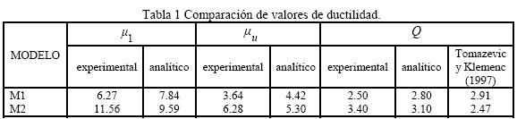 En la Tabla 1 se resumen los valores de ductilidad global y local, así como el del factor de comportamiento sísmico, calculados analíticamente y los obtenidos con los valores experimentales de Tomazevic y Klemenc (1997b). Además en la última columna se listan los valores del factor de comportamiento sísmico, Q ,calculado analíticamente por dichos autores. Se ve que tanto la ductilidad como los del factor de comportamiento sísmico predichos por el modelo son adecuados.