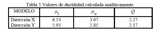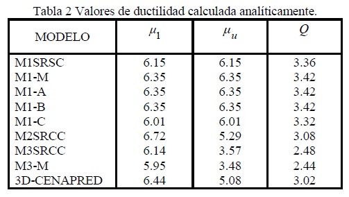 En la Tabla 2 se registran los valores de las ductilidades de entrepiso y global, así como del factor de comportamiento sísmico, calculados con la metodología desarrollada en este trabajo. En todos los casos el factor de comportamiento sísmico es mayor que el prescrito por la NTCM-RCDF (2004).