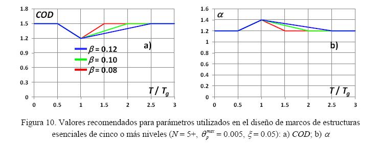 Con base en las demandas de ductilidad estimadas en la figura 7b y los valores de α y COD mostrados en las tablas 2 y 3, la figura 10 muestra ayudas de diseño para calcular los valores de COD y α necesarios para la aplicación de la metodología propuesta. La figura 10a muestra la variación de COD como función del periodo de los marcos a diseñar.