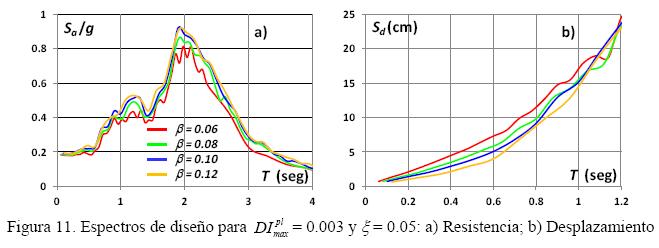 Si se supone que Δθmax = 0.002, de la ecuación 5 DImaxpl = 0.003 para θpmax de 0.005. Dado que la rotación plástica máxima de diseño es la misma, ambas versiones del edificio requieren que se formule el espectro de desplazamientos de diseño para una DImaxpl de 0.003. La figura 11 muestra espectros de diseño de resistencia y desplazamiento correspondientes a diferentes valores de β. Los espectros se establecieron a partir de la media + σ de los valores correspondientes a cada uno de los registros incluidos en la tabla 5.