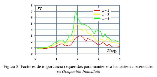 Mientras que la figura 7a muestra con una línea roja la resistencia que deben alcanzar los sistemas esenciales para mantenerse en Ocupación Inmediata después de la excitación sísmica de diseño para un amortiguamiento del 5% del crítico, la figura 8 muestra los factores de importancia que según las resistencias mostradas en la figura 7a requerirían ser usados para establecer la resistencia que deben desarrollar las estructuras del Grupo A si se usaran los espectros de resistencia correspondientes a ductilidades de 2, 3 y 4 y ξ de 5%. Es notoria la dependencia del factor de importancia con el periodo del sistema estructural y la ductilidad del espectro de resistencia. Además, es posible concluir que el valor de 1.5 utilizado actualmente para el factor de importancia resulta insuficiente para ductilidades de 3 y 4. En caso de una ductilidad de 2, el valor de 1.5 resulta escaso en un rango de periodos que va desde aproximadamente 1.5 segundos hasta 3 segundos.