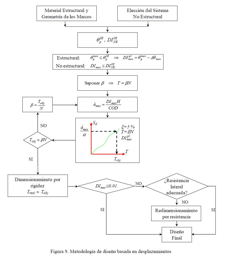 La metodología, mostrada esquemáticamente en la figura 9, es aplicable al diseño de estructuras esenciales conformadas por marcos rígidos que exhiben, tanto en planta como en elevación, regularidad en términos de su geometría, resistencia, rigidez y masa; y considera que las estructuras deben cumplir con el nivel de desempeño de Ocupación Inmediata después de ocurrido un evento sísmico. En un contexto cualitativo podría decirse que el nivel Ocupación Inmediata se cumple cuando después de la ocurrencia del sismo los elementos estructurales muestran daño leve y no se presenta daño no estructural. Cuantitativamente, para asegurar un comportamiento estructural y no estructural adecuados, la metodología de diseño requiere que las demandas máximas de rotación plástica (θpmax) y de distorsión de entrepiso (DImax) queden por debajo de límites prestablecidos (θpOI y DINEOI, respectivamente) de acuerdo al desempeño deseado.