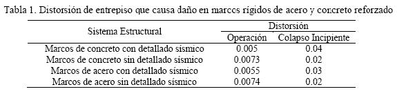 Se ha observado que los niveles de daño estructural y no estructural que un edificio exhibe después de una excitación sísmica, dependen de los valores que durante la misma adquiere el desplazamiento máximo (Qi y Moehle, 1991, Bertero y Bertero, 1992, Priestley et al., 2007). De igual manera, se ha llegado a la conclusión de que algunos contenidos de las estructuras son susceptibles a las demandas de velocidad y aceleración (Villaverde, 1997, Takahashi y Shiohara, 2004). En particular, mientras estos parámetros de respuesta (desplazamiento, velocidad y aceleración) se incrementan, mayor es el nivel de daño o degradación esperado en la estructura y sus contenidos. Dentro de este contexto, las propiedades estructurales que deben suministrarse a una estructura deben ser tales que controlen su respuesta lateral dentro de umbrales que sean congruentes con el nivel de daño o desempeño deseado para los elementos estructurales, elementos no estructurales y el contenido de la estructura. La tabla 1 resume valores de distorsión de entrepiso (DI) que pueden ser asociados a los niveles de desempeño de Operación y Prevención de Colapso de marcos rígidos de acero y concreto reforzado (Reyes, 2000).