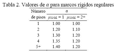 donde α es un factor que se calibra a partir del estudio analítico de edificios con sistemas estructurales similares al que se estudia. Con base en las recomendaciones del FEMA 306 (Applied Technology Council, 1998) y en los estudios llevados a cabo por Terán (Terán, 2004), la tabla 2 presenta valores de α que pueden utilizarse para el caso de edificios estructurados con base en marcos rígidos regulares. En caso de que el valor de µSIGL se encuentre en el rango que va de 1 a 2, es necesario interpolar con base en los valores incluidos en la tabla.