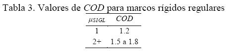 donde COD es un coeficiente que considera que la demanda de distorsión de entrepiso no es constante a lo largo de la altura del edificio. De manera similar a lo discutido para el parámetro α, COD debe calibrarse a partir del estudio analítico de sistemas estructurales similares al que se estudia. Con base en las discusiones planteadas por diversos autores (Qi y Moehle, 1991 y Bertero et al., 1991), y en los estudios presentados por otros (Terán, 2004), la tabla 3 ofrece valores de COD para marcos rígidos regulares. Mientras que en el caso de que el valor de µSIGL sea menor que 1 debe usarse un COD igual a 1.2, cuando esta demanda se encuentre en el rango que va de 1 a 2, es necesario interpolar con base en los valores incluidos en la tabla.