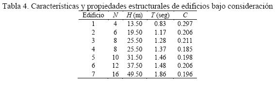 Para ilustrar la pertinencia de estimar las demandas de distorsión de entrepiso en marcos rígidos regulares a partir del uso del modelo de un grado de libertad discutido aquí, se aplica el modelo para predecir las demandas de desplazamiento de azotea y distorsión de siete edificios cuyo sistema estructural exhibe la configuración estructural mostrada en la figura 2. Conforme a lo discutido en detalle por Terán (1998), los edificios fueron diseñados conforme a la versión anterior del Reglamento de Construcciones para el Distrito Federal y sus Normas Técnicas Complementarias, para un coeficiente de comportamiento sísmico de 4 y la Zona del Lago del Distrito Federal. Conforme a las consideraciones de modelado discutidas por Terán (Terán, 1998), se prepararon modelos de análisis no lineales para los edificios, y se obtuvieron sus curvas de capacidad a partir de una serie de análisis estáticos no lineales. La tabla 4 resume las principales características y propiedades estructurales establecidas para los edificios a partir de sus curvas de capacidad y su modelado no lineal.