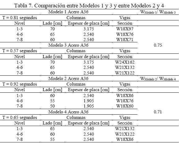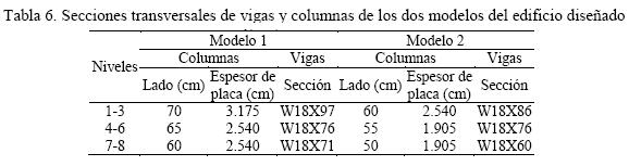 Conforme al diagrama de flujo de la figura 9, deben dimensionarse lo elementos estructurales de manera que el periodo fundamental de los marcos sea lo suficientemente cercano al valor de Tobj. La tabla 6 resume las dimensiones de vigas y columnas para las dos versiones del edificio. Mientras que para el Modelo 1 se obtiene un Treal de 0.81 segundos, para el Modelo 2 se obtuvo un periodo de 0.97 segundos. En ambos casos, se consideró acero A36 para los elementos estructurales de los marcos.