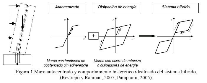 Un muro autocentrado consiste en un muro de concreto reforzado ligado a la cimentación mediante un tendón postensado anclado a la zapata, sin unión monolítica entre el muro y la cimentación. Para dotar al muro de capacidad de disipación de energía ante acciones sísmicas se incluyen barras de acero dúctil, para formar lo que se denomina un sistema híbrido (fig. 1). Para una mayor efectividad del preesfuerzo, el tendón no está adherido al muro. Los estudios iniciales que se encuentran en la literatura estuvieron orientados a definir las características elásticas e inelásticas de la relación fuerza-desplazamiento lateral de los muros autocentrados como elementos estructurales aislados.