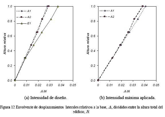 La fig. 11 muestra las envolventes de aceleraciones medidas de piso divididas entre la aceleración máxima de la base, versus la altura relativa de piso (definida como el cociente entre la altura de piso y la altura total del edificio), para los sismos empleados. Los especímenes A1 y E1 tienen un perfil de envolventes parecido (fig. 11a), salvo por la amplificación en el último piso, mayor en el caso del espécimen E1, debido a una falla local en la armadura que formaba la conexión entre el marco y el muro en el último piso. La fig. 12 muestra las envolventes de desplazamientos laterales relativos a la base, Δi, divididos entre la altura total del edificio, H. Estos desplazamientos están en función de la altura relativa de piso. La relación Δi/H para el nivel de azotea se conoce también como distorsión global. Para los sismos de intensidad de diseño, las distorsiones globales máximas fueron iguales a 3.6%, 2.8% y 2.9% en los especímenes E1, A1 y A2, respectivamente. Para los sismos de intensidad máxima aplicada, las distorsiones globales máximas fueron iguales a 4.1% en los especímenes A1 y A2. En particular, la forma lineal de las envolventes de desplazamientos de los especímenes A1 y A2 sugiere que la distorsión de entrepiso máxima puede aproximarse a la distorsión global del edificio.