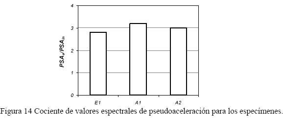La fig. 13 presenta espectros de piso, es decir, espectros de respuesta de pseudoaceleración (Sa) para el último piso de los especímenes ensayados, divididos entre la aceleración máxima de la base (PGA). Los espectros fueron calculados a partir de la respuesta de osciladores elásticos con una fracción de amortiguamiento igual a 2% sometidos a un movimiento de la base definido por la aceleración medida en el último piso de cada espécimen. Este valor es menor que el comúnmente empleado para espectros de diseño, y su empleo se basa en resultados de ensayes de un edificio de siete niveles en mesa vibradora, los cuales mostraron que el emplear en análisis dinámicos no lineales valores de la fracción de amortiguamiento crítico mayores que 2% lleva a subestimar de manera importante los desplazamientos laterales de la estructura (Panagiotou, 2008, Martinelli y Filippou, 2009). En cada figura se muestran dos espectros; la línea delgada continua representa la respuesta elástica del espécimen y la línea gruesa representa el espectro de respuesta correspondiente a la respuesta inelástica del espécimen; además se indican, en línea vertical discontinua, los periodos de los dos primeros modos de vibración de las estructuras obtenidas con la respuesta elástica de los especímenes. La magnitud de la reducción de la respuesta se valuó con el cociente entre los valores espectrales de pseudoaceleración obtenidos para la respuesta elástica y aquellos obtenidos para la respuesta inelástica, en los periodos predominantes de las estructuras considerando la elongación de los periodos que ocurre como consecuencia de la acción sísmica. Los periodos predominantes en el comportamiento inelástico fueron iguales a 0.49s, 0.49s y 0.45s, en los especímenes E1, A1 y A2, respectivamente, mientras que en el comportamiento elástico fueron iguales a 0.41s, 0.38s y 0.26s en los mismos especímenes. En la fig. 14 se muestran para el periodo fundamental los valores calculados del cociente entre los valores espectrales elásticos e inelásticos mostrados en la fig. 13, que confirman las observaciones realizadas a partir de los espectros de respuesta. No fue posible establecer con certeza la magnitud de la reducción en el segundo modo, debido a la dificultad de definir la contribución de este modo de vibración en los espectros de piso obtenidos con la respuesta inelástica. Además, se debe observar que la frecuencia del segundo modo de vibración del espécimen A2 fue mayor que la frecuencia máxima del registro filtrado, igual a 30 Hz, por lo que el comportamiento capturado en las mediciones obtenidas en los ensayes de este espécimen correspondió sólo al primer modo de vibración.