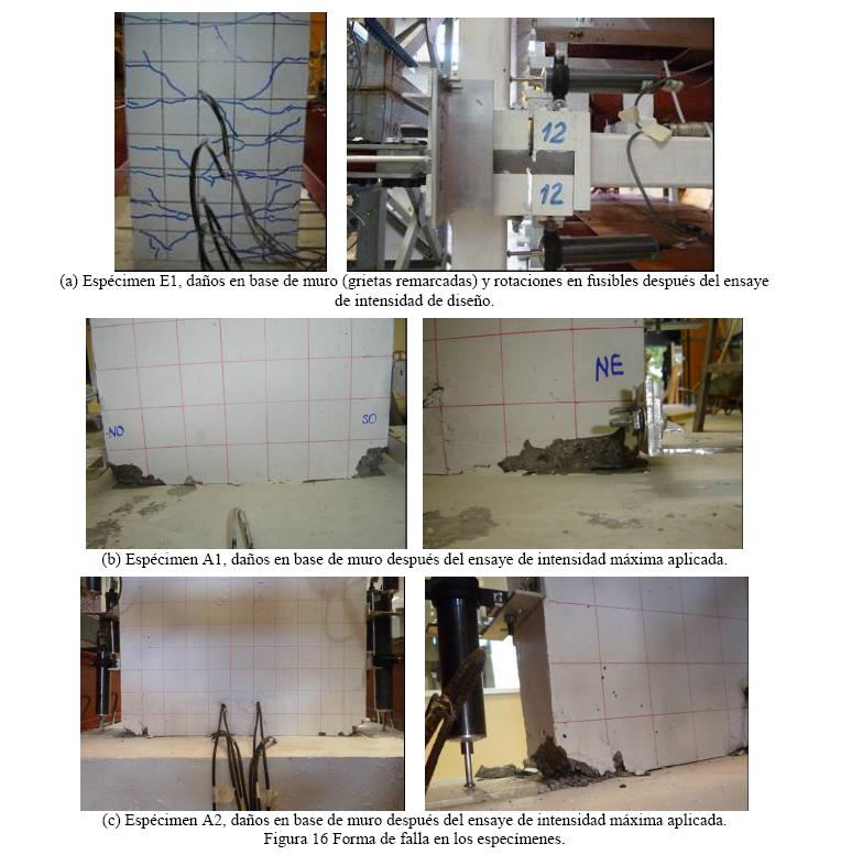 La falla del sistema en el espécimen E1 se manifestó en las articulaciones plásticas de los fusibles del marco, las que de acuerdo con las mediciones obtenidas con potenciómetros (fig. 16a), presentaron ductilidades de rotación máximas iguales a 4.9 en vigas y 5.2 en columnas, y en la parte inferior del muro, donde la mayor cantidad de grietas se observó hasta una altura aproximada de 2.5 veces la longitud del muro (fig. 16a). En la base del muro de este espécimen se obtuvieron grietas de hasta 0.5mm de espesor (Sánchez, 2008).
