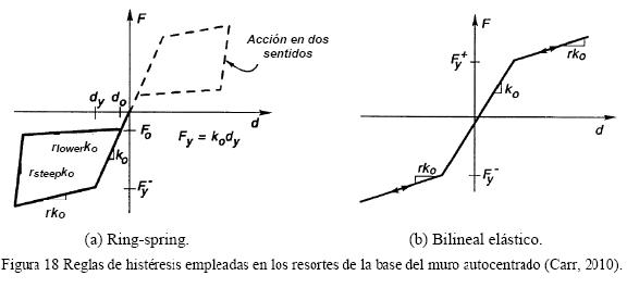 Los sistemas autocentrados pueden ser modelados usando técnicas aparentemente detalladas tales como el uso de elementos finitos o elementos tipo fibra. Sin embargo, una técnica bastante práctica de modelado es el uso de un modelo de plasticidad concentrada, para lo cual generalmente se emplea uno o más resortes rotacionales. El modelo de histéresis puede ser calibrado mediante el uso de resultados experimentales o de una estrategia analítica (Pampanin et al, 2001; Pennucci et al, 2009). Aunque generalmente se considera que el comportamiento histerético de estos elementos puede aproximarse a uno del tipo bandera (fig. 1), los trabajos anteriormente citados sobre ensayos de muros con postensado no adherido y barras disipadoras en la base del muro, mostraron que realmente ocurre una reducción progresiva de la rigidez inicial debido a la abertura en la base del muro y el comportamiento no lineal del concreto en la base.