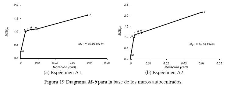 Se calculó la curva momento-rotación de la base de los muros con base en las consideraciones del documento ACI-ITG-5.2-09 (2009), empleando las características geométricas de la sección transversal y las propiedades mecánicas de los materiales usados. Se distinguieron seis estados principales para definir la curva: (a) decompresión o levantamiento inminente del muro; (b) fluencia en el disipador más tensionado, al que corresponden los valores de momento y rotación My y θy, respectivamente; (c) fluencia en los dos disipadores; (d) inicio del endurecimiento por deformación en un disipador; (e) inicio del endurecimiento en los dos disipadores; y (f) rotura del disipador más tensionado o fluencia del tendón más tensionado (lo que ocurra primero según el criterio de diseño), a este estado corresponden los valores de momento y rotación Mu y θu, respectivamente. Estos estados para la base de los muros de los especímenes A1 y A2 se muestran en la fig. 19.