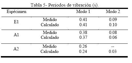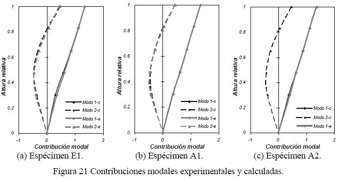 La tabla 5 resume los periodos de vibración obtenidos con las mediciones experimentales de los especímenes en el ensaye de baja intensidad y aquellos calculados con los modelos de análisis. Estos periodos (T1, T2), para la respuesta elástica (sismo de baja intensidad) se han mostrado en la Fig 13. Como se ha mencionado, no fue posible obtener el segundo modo de vibración del espécimen A2. En la fig. 21 se muestran las formas de las contribuciones modales, Γmi, definidas para un modo i-ésimo como el producto del factor de participación modal Γi y las amplitudes modales Φi, calculadas con los modelos analíticos (modo i-c) y las obtenidas con las mediciones experimentales (modo i-e), en los tres especimenes, observándose una concordancia aceptable. Las amplitudes modales a partir de la información experimental fueron obtenidas aplicando el procedimiento descrito por Elgamal (2005). Los amortiguamientos modales fueron obtenidos mediante el procedimiento empleado por Rodríguez et al (2006), con base en resultados experimentales a partir de la respuesta elástica de los especímenes en los ensayes de baja intensidad. Para el espécimen A1, los porcentajes de amortiguamiento calculados con los resultados experimentales fueron iguales a 1.5% y 2.0% para el primer y segundo modo, respectivamente. Para el espécimen A2, el porcentaje de amortiguamiento calculado con los resultados experimentales para el modo predominante fue igual a 4.0%, este valor fue ligeramente mayor que el calculado con los resultados del ensaye de vibración libre, el cual fue igual a 3.0%. Para el espécimen E1, los porcentajes de amortiguamiento calculados con los resultados experimentales (Sánchez, 2008) fueron iguales a 1.5% y 3.0% para el primer y segundo modo, respectivamente.