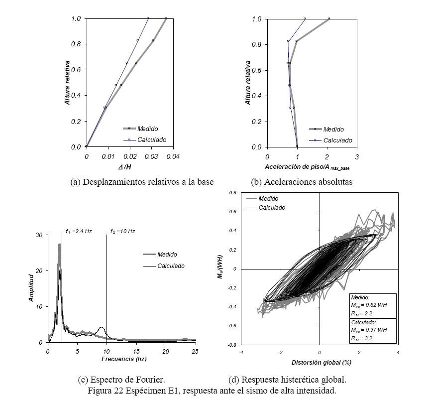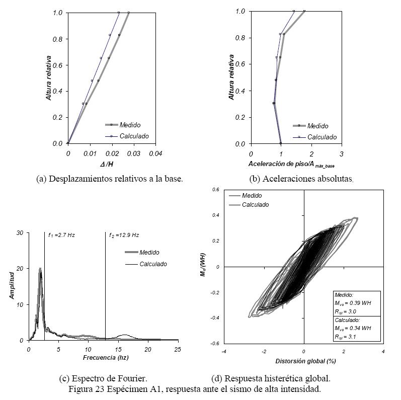 Las figuras 22 a 24 (fig 23) permiten comparar diversos resultados experimentales y calculados empleando el programa Ruaumoko. En estas figuras, los resultados experimentales medidos se muestran en línea gruesa clara y los resultados calculados con el modelo de análisis se muestran en línea delgada oscura. Las figuras (a) permiten comparar las envolventes de desplazamiento de piso relativo a la base, Δi, dividido entre la altura total del edificio, H, en función de la altura relativa de piso (cociente entre la altura total de piso y la altura total del edificio). Las figuras (b) presentan las envolventes de aceleraciones absolutas máximas de piso con la altura relativa de piso. Las figuras (c) permiten comparar las magnitudes del espectro de Fourier y el contenido de frecuencias de las aceleraciones en el piso 5. Las figuras (d) presentan los ciclos de histéresis de momento de volteo en función de la distorsión global (cociente entre el desplazamiento del último piso entre la altura total del espécimen).