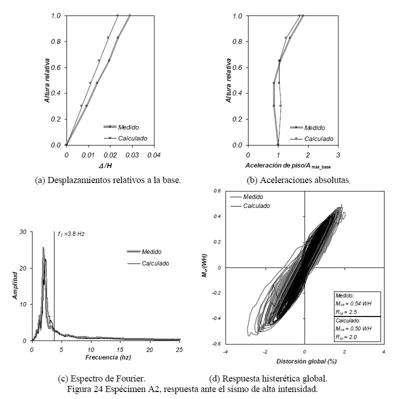 En el espécimen A2, la envolvente de desplazamientos (fig. 24a) presenta también un perfil prácticamente lineal, lo cual refleja el predominio del muro en el comportamiento del sistema. Las envolventes de las figuras 24a y 24b permiten apreciar que la correlación entre los resultados medidos y calculados es aceptable. Del mismo modo que lo observado en el espécimen A1, la semejanza entre los espectros de Fourier (fig. 24c), así como entre los ciclos de histéresis del momento de volteo versus distorsión global (fig. 24d) permite apreciar la bondad de la predicción del contenido de frecuencias en el intervalo inelástico con el modelo propuesto. En la fig. 24d se aprecia que los valores máximos de distorsiones de entrepiso y momentos de volteo calculados fueron del orden del 80% y 94% de los valores medidos, respectivamente.