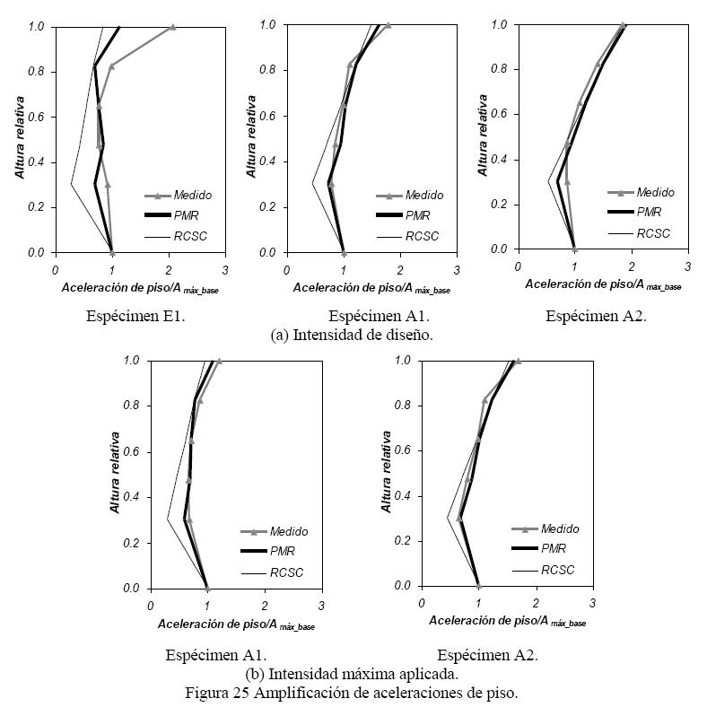 La fig. 25 muestra la envolvente de las aceleraciones de piso divididas entre la aceleración máxima de la base, para los especímenes en los movimientos de intensidad de diseño y de intensidad máxima aplicada, medidas y calculadas por dos procedimientos analíticos. Estos modelos fueron el análisis modal espectral empleado en la práctica, con la técnica de la raíz cuadrada de la suma de los cuadrados y la reducción de todas las contribuciones modales por el factor RM (RCSC), y el análisis modal espectral con la reducción de la contribución del primer modo (Primer Modo Reducido, PMR; Rodríguez et al, 2002). En general, se observa una mejor correlación entre los valores medidos y los calculados reduciendo solamente la contribución del primer modo. Un caso particular es el del espécimen A2, que presenta una correlación notoria entre los valores medidos y los calculados con los dos procedimientos analíticos, debido a que en este espécimen la respuesta capturada experimentalmente correspondió al modo fundamental de vibración. En general, es posible aplicar procedimientos como el del PMR para el cálculo de las aceleraciones máximas de piso de las estructuras muro-marco con muros autocentrados, de manera similar a su aplicación en estructuras convencionales.