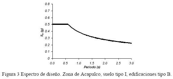 El espectro de diseño adoptado fue el de la NTCS del Estado de Guerrero (RCEG, Reglamento de Construcciones para los Municipios del Estado de Guerrero, 1989), suelo firme (tipo I), para la zona de Acapulco (zona D) y edificaciones tipo B (fig. 3). La ordenada espectral fue la máxima correspondiente a la zona plana del espectro. El factor de comportamiento sísmico empleado (Q) fue igual a 2 y la distorsión relativa de entrepiso máxima especificada fue 0.012. El coeficiente sísmico de diseño fue igual a 0.25.