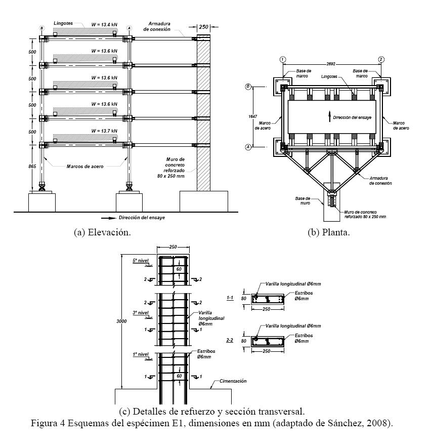 El sistema estructural del espécimen E1 fue del tipo dual, en el que se combinó dos marcos de acero y un muro convencional, este último diseñado para tener una participación del 60% del cortante total de diseño en la base, que implicó una participación del 29% del momento de volteo total de diseño (Sánchez, 2008). Antes de los ensayes se obtuvieron características de las propiedades mecánicas de los materiales usados, cuyos resultados se muestran en la tabla 1. Como se aprecia en esta tabla, el acero de refuerzo del muro de este espécimen correspondió a varillas corrugadas de 6 mm de diámetro, las que se importaron de Nueva Zelandia, ya que refuerzo corrugado con este diámetro no se produce en México. El esfuerzo de fluencia de este refuerzo fue 480.2 MPa (tabla 1), valor cercano a los que tendrían aceros de refuerzo producidos en México. El peso total del espécimen fue de 67.9 kN. El muro tenía una sección de 0.25x0.08m, y una altura de 3000 mm, fig. 4. En dicha figura, se presentan los esquemas de elevación y planta del espécimen, así como la sección transversal con el refuerzo del muro, con indicación de los pesos en cada piso. La unión entre el muro y los marcos se logró mediante el empleo de una armadura rígida en cada uno de los cinco niveles, Fig 4. Esta armadura se conectaba al muro y los marcos mediante un sistema de articulaciones, de manera de representar el comportamiento que tendría una barra con sólo carga axial en ésta (Sánchez, 2008).
